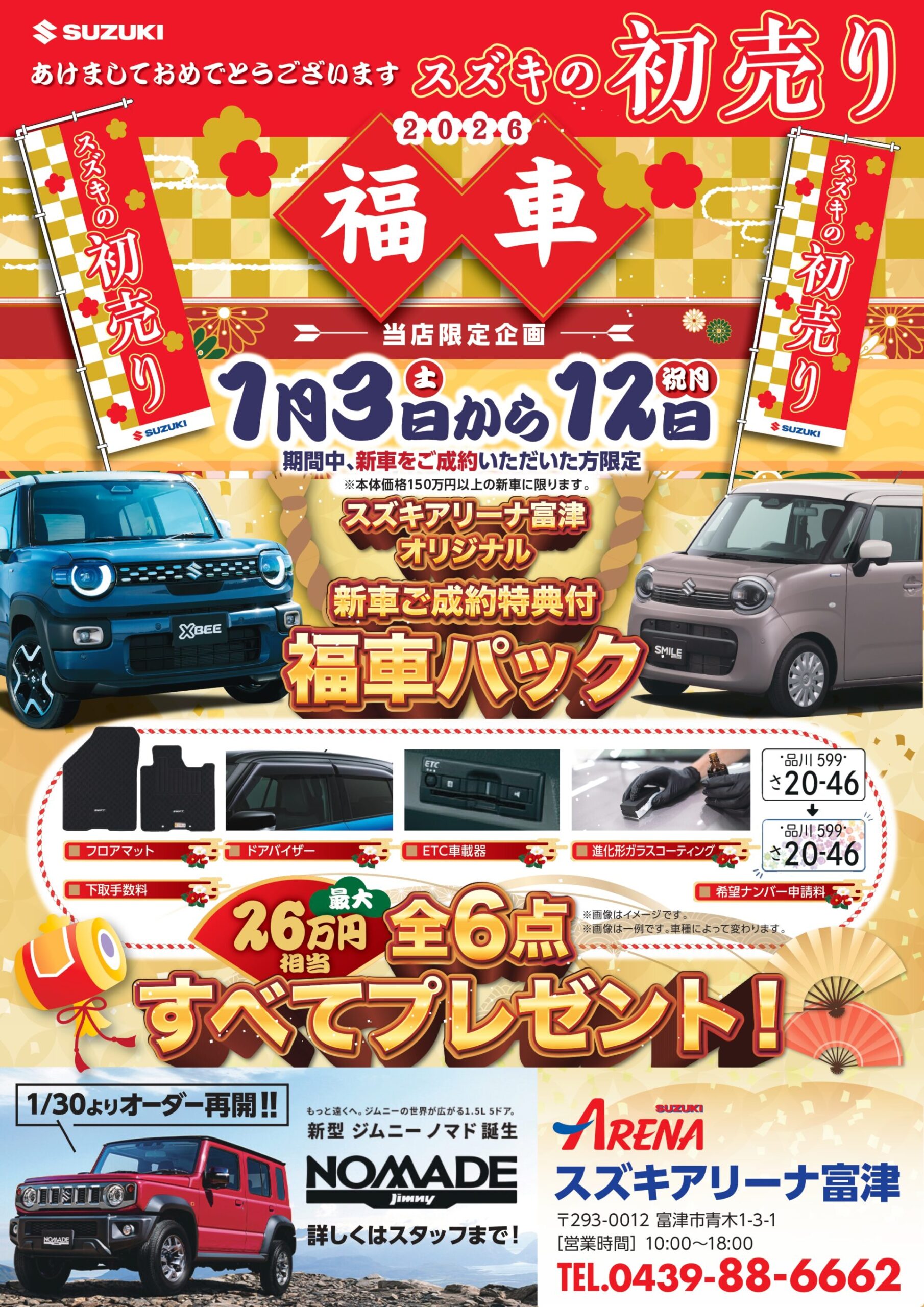 初売りスタートです! 2026.01.03 お知らせ 新年あけましておめでとうございます。 本年もよろしくお願いいたします。 早速準備してお待ちしております。 初売りの詳細はこちらから! スズキアリーナ富津限定の福車パックや 成約特典を準備しております! 皆様のご来店お待ちしております。